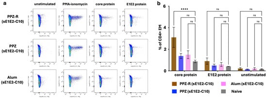 Antigen-specific memory T cells primed by a vaccine must persist for a long time in animals to provide enhanced protection during a subsequent rechallenge. Typically, effector T cells (marked by higher levels of the surface marker CD44) are formed in the first weeks after immunization, but the persistence of antigen-specific T cells with such a phenotype beyond the 3–4 months of challenge is evidence of the generation of durable immunological memory. Accordingly, to evaluate the presence of long-term memory T cell responses generated by the VMPNs in mice, we further boosted immunized mice at Day 136 and isolated single-cell suspensions 7 days later. Effector cytokine production in an antigen-specific manner is a strong correlate of such memory T cells [75]. The data in Figure 6 compare the responses of isolated splenocytes by measuring intracellular IFNγ upon restimulation with E1E2 or core proteins (with PMA/Ionomycin used as a positive control polyclonal stimulator). Cells were analyzed by gating on the live CD4+ population (gating strategy discussed in Supplementary Materials Figure S7). CD4 T cells from the PPZ-R-vaccinated mice, re-stimulated with core protein, show a significant increase in the proportion of IFNγ producers within the CD44-hi (effector/memory phenotype) subset compared to those from PPZ or Alum immunizations. At this time-point, no significant response to E1E2 proteins was observed; in previous studies, lymphoproliferative responses tended to be higher for core than for E1E2 [30].