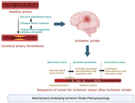 The blockage of blood flow in ischemic strokes results in a cascade of events leading to brain injury [56,57,58]. The immediate lack of oxygen (hypoxia) and glucose triggers a series of metabolic disturbances. Neurons begin to die within minutes due to energy failure, releasing excitatory neurotransmitters like glutamate. This causes excitotoxicity, where excessive calcium influx into neurons leads to further cellular damage and death. Additionally, the affected area, known as the ischemic core, is surrounded by the ischemic penumbra, where cells are at risk but still salvageable with timely intervention [59].