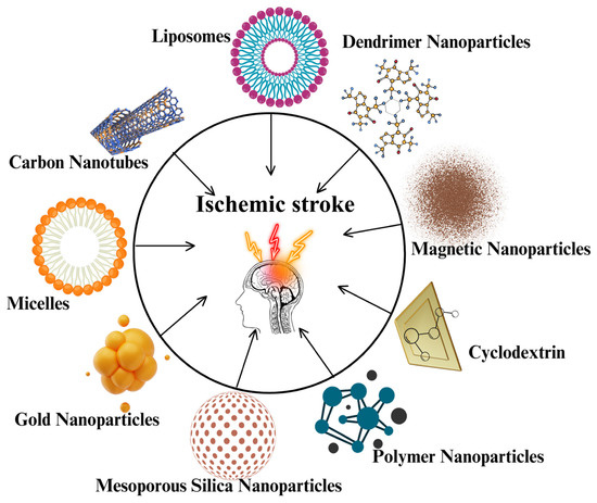 The increased detection and alteration of disease-causing processes at the molecular level has made nanotechnology an advanced medical technology [91]. The unique characteristics of nanomaterials (NMs), such as large surface area, are offered to transport drugs or image markers to a specific location within the body [92]. There are various NPs like silica NPs, metallic NPs (gold, silver) [93], carbon nanotubes (CNTs), metal oxide NPs (magnetic NPs), polymeric NPs, dendrimers, liposomes, micelles, etc., are widely used as drug carriers or diagnostic purposes for the management of stroke (shown in Figure 3). Encapsulating drugs or imaging markers protects them from unwanted biological actions. Their capacity to bind to proteins for targeted delivery to specific biochemical areas has enhanced imaging and drug effectiveness in diagnosing and treating strokes. Figure 3 shows the various types of NPs that target ischemic stroke.