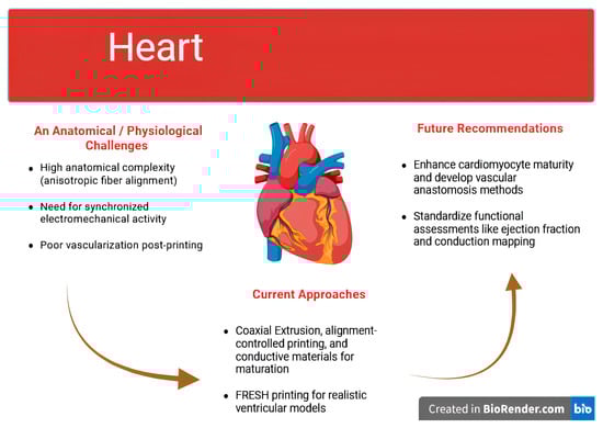 The human heart is a biomechanically and electrophysiologically complex organ, making it one of the most demanding targets for regenerative bioprinting. It is composed of multiple, functionally specialized cell types, primarily cardiomyocytes, fibroblasts, vascular endothelial cells, and smooth muscle cells, arranged in a highly anisotropic and hierarchical manner. This alignment is critical for the propagation of electrical signals and the generation of synchronized contractions. The left ventricular myocardium, for example, exhibits helically oriented fiber layers that optimize ejection fraction and mechanical efficiency. Any construct intended to replace or augment cardiac tissue must replicate not only the structural layout but also the functional integration of excitation–contraction coupling [20].