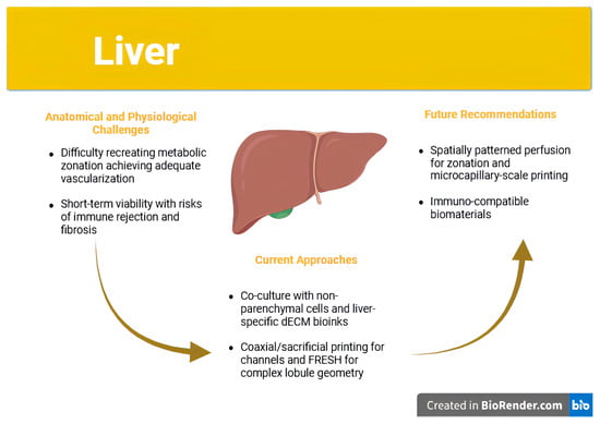 One of the foremost challenges in liver bioprinting is achieving functional vascularization. The liver receives approximately 25% of the cardiac output and relies on a low-pressure, high-volume system to perfuse sinusoids and deliver metabolic substrates. Without sufficient perfusion, even the most sophisticated cell-laden constructs are prone to central necrosis and functional decline. Coaxial bioprinting, which enables the formation of hollow, perfusable channels surrounded by supportive matrix and endothelial cells, has shown promise in creating hepatic lobule-like geometries [3,97]. Other approaches using sacrificial inks, such as Pluronic F127, can form networks of microchannels that are endothelialized post-printing to simulate sinusoidal flow [97].