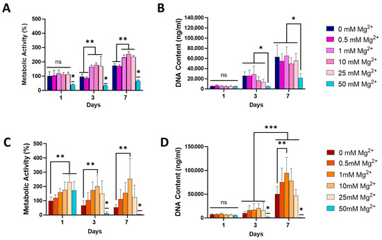 The effect of Mg2+ concentration on metabolic activity of MC3T3-E1 (A) and RAW 264.7 (C) cells and the DNA content of MC3T3-E1 (B) and RAW 264.7 (D) cells, indicative of proliferation. Error bars represent the standard deviation for n = 6. * p < 0.05 compared to all groups, ** p < 0.05 compared to indicated groups, *** p < 0.05 between all groups Day 3 and all groups Day 7, ns p > 0.05 (non-significant), as determined by two-way ANOVA.