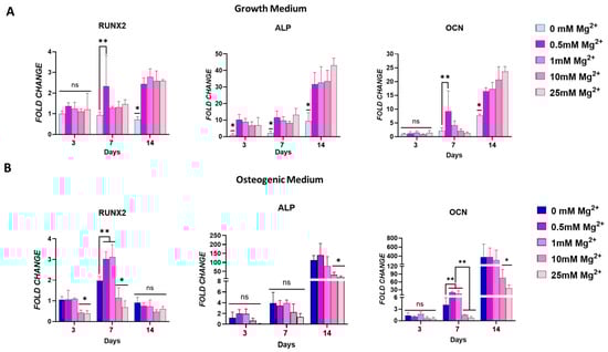 Osteogenic gene expression for RUNX2, alkaline phosphatase (ALP), and osteocalcin (OCN) in osteoblasts cultured in standard growth media (A) and osteogenic media (B). Effect of Mg2+ concentration on ALP activity in both culture conditions (C). Images showing ALP staining (D) and mineralisation (E) as an effect of Mg2+ concentration. Error bars represent the standard deviation for n = 6. * p < 0.05 compared to all groups, ** p < 0.05 compared to indicated groups, ns p > 0.05 (non-significant), as determined by two-way ANOVA. Scale bars = 150 µm.