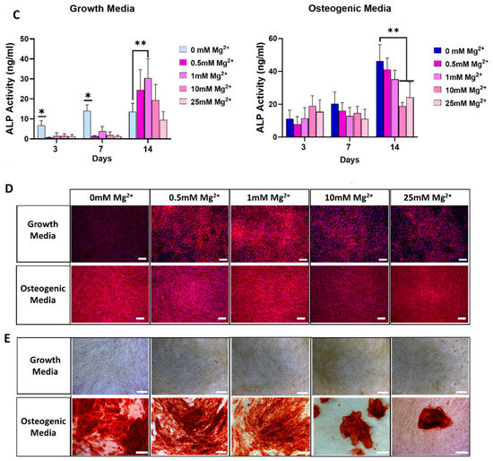 Mg2+ showed an initial inhibitory effect on ALP activity on days 3 and 7 in growth media. This effect was reversed at day 14, when cells exhibited higher ALP activity levels, in a concentration-dependent fashion, peaking at 1 mM and decreasing at higher concentrations. In osteogenic media, exposure to Mg2+ did not significantly increase ALP activity at any time point. In fact, higher Mg2+ concentrations reduced ALP activity at day 14 (Figure 2C). ALP staining at day 14 further confirmed this trend, where lower Mg2+ concentrations in growth media increased ALPs levels, but had no impact in osteogenic media. On the other hand, the effect of higher concentrations in growth media was negligible, while in osteogenic media ALP activity decreased (Figure 2D). Overall, cells exposed to lower Mg2+ displayed increased ALP activity, corroborated by ALP staining, compared to cells exposed to higher Mg2+ in both media conditions.