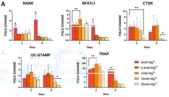 To explore the role of Mg2+ in regulating osteoclast differentiation, the effect of increasing concentrations on the expression of early- and late-stage osteoclast markers was assessed. Additionally, osteoclast multinucleation and the number of TRAP-positive cells and actin rings was analysed (Figure 3). In the early stages of differentiation (day 3), an increase in the expression of some osteoclast markers was observed. At this time point, cells exposed to a moderate Mg2+ concentration, 1 mM, demonstrated elevated expression of osteoclast genes NFATc1 and TRAP, but reduced RANK expression levels (Figure 3A). In fact, expression of RANK was reduced by exposure to any Mg2+ concentration. Regarding the expression of OC-STAMP, a marker implicated in the fusion of osteoclast precursors, it was not affected by the presence of Mg2+. During osteoclast maturation (day 5), the expression of RANK and NFATc1 significantly decreased in all Mg2+ groups. The expression of OC-STAMP, TRAP, and CTSK decreased with increasing Mg2+ concentrations and was markedly inhibited in cells exposed to higher Mg2+ concentrations.