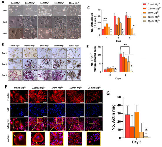 Due to the demonstrated cytotoxic effects observed at 50 mM Mg2+, for both tested cells, this concentration was not taken forward in further experiments. Therefore, 0.5, 1, 10, and 25 mM were used to study the effect of Mg2+ on osteogenesis and osteoclastogenesis.