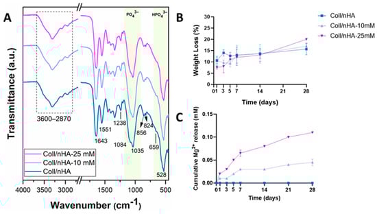 The scaffolds’ composition was determined by FTIR in order to confirm the successful incorporation of Mg2+ (Figure 4A). The sharp peaks observed within the fingerprint region (500–1200 cm−1) of the Coll/nHA spectra are mainly attributed to the vibrational modes of the PO43− ions. The strong peak at 528 cm−1 and shoulder at 659 cm−1 are consistent with the interaction between phosphate and hydrogen. The peak at 1035 cm−1 corresponds to the asymmetric stretching mode of the P–O bonds. The incorporation of Mg2+ caused a minor decrease in the peaks’ intensity, potentially caused by a decrease in apatite crystallinity. Importantly, this did not drastically alter the scaffold structure, as the spectra for both 10 and 25 mM Mg2+ resemble that of Coll/nHA. Furthermore, the bands at 2870–3600 cm−1, primarily assigned to adsorbed water, were consistent across groups, indicating that bioceramic incorporation did not alter the hydrophilicity of the collagen structure in any of the three scaffold groups.