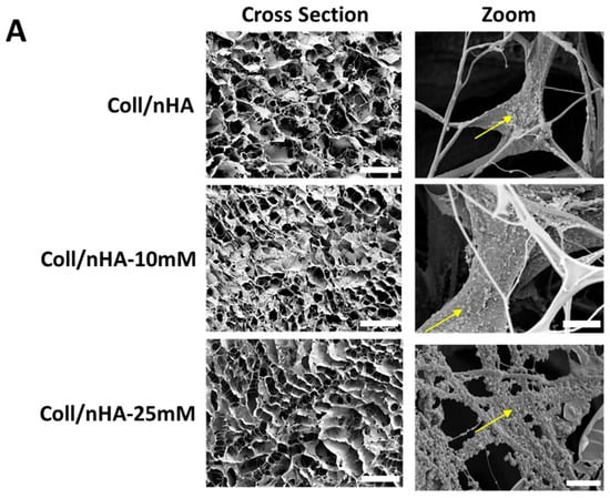Biomimetic scaffolds are attractive systems for tissue engineering applications, as they can be finely tuned in order to closely mimic native ECM architecture. In addition, they can also be used as effective delivery systems, as the release rate can easily be modulated based on the scaffold properties (porosity, pore size, crosslinking, etc.) []. Type I collagen–hydroxyapatite composite scaffolds are particularly attractive as bone substitutes, not just because they are composed of the two main components of native bone, but also due to their ability in providing an appropriate ECM-like environment that supports cell attachment, proliferation, differentiation, and new bone tissue formation. Hydroxyapatite (HA) is the most extensively studied bioceramic for bone regeneration, due to its chemical and structural similarity to biological mineral apatite [,,]. Although not very soluble, the HA surface provides nucleating sites for precipitation of apatite crystals in culture medium and in body fluids, which contributes to its known bioactivity [,]. Biological apatite deviates from stoichiometric HA due to its numerous ionic substitutions on either the Ca cationic positions (Mg2+, Zn2+, Sr2+), the PO43− anionic sites (HPO43−, CO32−, SiO43−), or the OH− anionic sites (CO32−, F−) together with the presence of ion vacancies in the crystal lattice. This makes HA an attractive material for further functionalization. In particular, nanoscale HA (nHA) has recently been the focus of bone engineering research, as it better mimics the structure of bone mineral, thus improving the biological and resorption behaviour compared to microscale HA. The nanostructure allows a higher surface-to-volume ratio, favouring adhesion, proliferation, and differentiation of osteoprogenitor cells, thereby enhancing osteointegration and deposition of apatite mineral on its surface better than microcrystalline HA, leading to enhanced formation of new bone tissue within a short period. Moreover, nHA is easier to produce, as it requires lower sintering temperatures, making it a material with high potential for bone biomimetic scaffold development [,,,].
