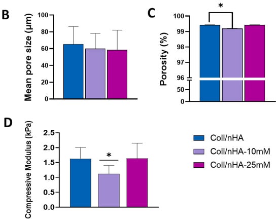 To further assess the impact of Mg2+ incorporation on scaffolds, their mechanical properties and microarchitectures were assessed (Figure 5). The effect of Mg2+ functionalisation on scaffold porosity and microarchitecture was evaluated by SEM analysis. SEM micrographs revealed that all scaffolds, independently of Mg2+ content, exhibited a highly porous and interconnected network, with nHA particles aligned alongside the collagen fibres (Figure 5A). Quantitative analysis confirmed that Mg2+ functionalisation did not significantly affect the mean pore size of the scaffolds, which remained at ~60 µm (Figure 5B). Similarly, the Mg2+ functionalisation did not affect the porosity of the scaffolds. All scaffold groups remained highly porous, with values of above 98% (Figure 5C). A lower compressive modulus was observed in the Coll/nHA-10 mM scaffolds compared to the Coll/nHA and Coll/nHA-25 mM groups; however, this decrease in mechanical properties was non-significant (Figure 5D).