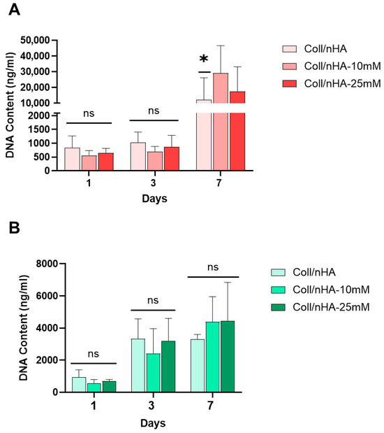 The effect of Mg2+ on MC3T3-E1 (A) and RAW 264.7 (B) cell proliferation within Coll/nHA scaffolds. Error bars represent the standard deviation for n = 6. * p < 0.05 compared to all groups, ns p > 0.05 (non-significant), as determined by two-way ANOVA.