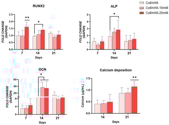 Next, we assessed the potential of Mg2+-functionalised scaffolds to promote osteoblast differentiation and evaluated whether delivery of Mg2+ via Coll/nHA scaffolds could negate the inhibitory effect on osteogenesis observed in 2D culture (Figure 7). An early increased expression in RUNX2 was observed at day 7 in the Coll/nHA-25 mM Mg2+ scaffold group compared to the other scaffold groups. By day 14 this increase was only significant compared to the Mg2+-free Coll/nHA group. ALP expression peaked at day 14 in all scaffold groups. However, the Coll/nHA-25 mM Mg2+ scaffolds demonstrated a significant increase in ALP expression at this time point compared to the Mg2+-free Coll/nHA scaffolds. There was no significant difference in OCN expression between the Coll/nHA-10 mM and Coll/nHA-25 mM scaffolds. Nevertheless, OCN gene expression was significantly upregulated at day 14 in both 10 mM and 25 mM Mg2+ scaffolds compared to Mg2+-free Coll/nHA group. An increase in calcium deposition was observed in all scaffold groups between days 14 and 21. At day 21, the Coll/nHA-25 mM had a significant increase in calcium deposition compared to the other scaffold groups.