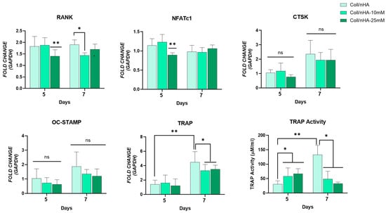The impact of Mg2+-loaded scaffolds on osteoclastogenic gene expression was varied. CTSK and OC-STAMP expression was not altered. Both 10 and 25 mM Mg2+ reduced RANK expression, while NFATc1 levels only decreased with 25 mM Mg2+ scaffolds. TRAP gene expression increased in all scaffold groups from day 5 to day 7. However, this increase was significantly lower in 10 and 25 Mg2+ than in magnesium-free scaffolds. Following a similar pattern, TRAP activity at day 5 was higher in the presence of magnesium but did not increase further at day 7. On the other hand, Coll/nHA scaffolds were not capable of inhibiting the increase in TRAP activity over time, resulting in a significantly higher level when compared to both Mg2+ concentrations, highlighting the vital role that magnesium plays in the inhibition of osteoclastogenesis. The majority of research regarding the use of Coll/nHA-based scaffolds for bone tissue engineering focuses on their osteogenic potential, and their direct impact on osteoclastogenesis has been scarcely studied. Nevertheless, it has been reported that Coll/nHA scaffolds alone can indirectly decrease osteoclastogenesis by promoting osteoblast activation and reducing the number of inflammatory and osteoclast precursor cells [,]. Similarly, scaffolds containing magnesium have been shown to reduce bone resorption and inhibit osteoclastogenesis via immunomodulation, namely the suppression of the RANK pathway in macrophages []. In addition, Muller et al. [] have shown that the increase in local pH due to Mg2+ sustained release also suppresses osteoclastogenesis. Our data point to similar findings, as the incorporation, and sustained release of Mg2+ in the scaffolds resulted in a reduction of key osteoclastogenic markers. Notably, unlike the 2D results, one single concentration of Mg2+ incorporated in the scaffolds was able to simultaneously promote osteogenesis and inhibit osteoclastogenesis.