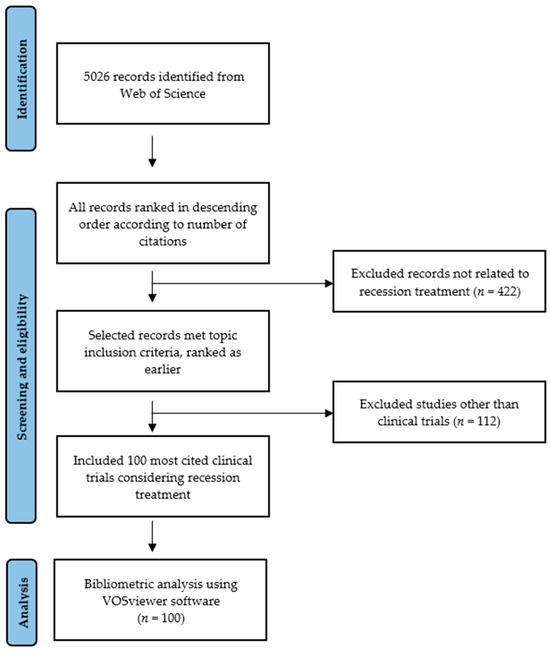 By 30 September 2024, 5026 records were found in the database. The searched works were not limited by publication date; only a filter for the English language and the publication type “article” was applied. Among which the 100 most cited English-language clinical trials focusing on gingival recession treatment were selected manually (Table S1: List of 100 most-cited clinical trials on gingival recession treatment with total citations). Only RCT (randomized controlled trials) were included for the analysis. The exclusion criteria were publications defined as: expert opinions, animal and cell studies, case reports, case-series, case–control studies, cohort studies, systematic reviews. Two researchers (B.G. and A.S.) made the selection based on titles, abstracts, and full texts. Disagreements between the investigators were resolved through discussion. The search process is shown in Figure 1. The main domain of the articles was identified. The data concerning the included studies were exported into an Excel spreadsheet directly from WoS.
