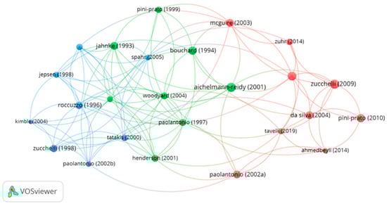 Figure 4 shows the visualization of the citation network for 25 articles with the largest number of connections. Among them, the most links were demonstrated by Woodyard et al. (2004) [Table S1] located in the central green cluster connecting two adjacent clusters–the blue one with more connections and the red one with fewer and weaker connections. Three main color groups indicate close cooperation between the authors of the same collection.