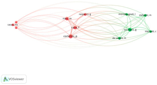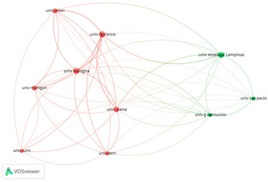 In the network of university links, the Italian centers dominated (Figure 6). The University of Florence had the highest total link strength (110), although it did not have the highest number of citations. In addition, two Brazilian universities, one American and one Swiss university were also identified. Two main color groups indicate close cooperation between the authors of the same collection.