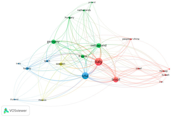 The analysis of links between countries considered all, even those with one published paper in the top 100 (Figure 7). In the presented network the clear dominance of Italy was observed (total link strength 564), ahead of the USA (total link strength 430) and Switzerland (total link strength 287).