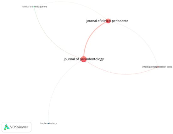 The network of links between journals was mainly based on the axis between two of them: Journal of Periodontology (total link strength 235) and Journal of Clinical Periodontology (total link strength 211)—Figure 8. Two main bubbles indicate the most influential journals.