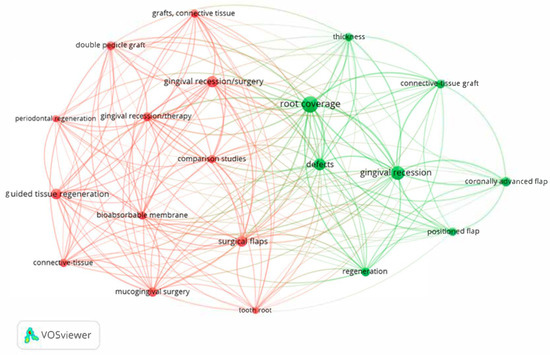 The graphical links for the co-occurrence analysis for these keywords are presented in Figure 9. The largest total link strength presented the keyword “root coverage” (233, representative of the green cluster), followed by the keyword “gingival recession/surgery” (153, representative of the red cluster). Each cluster (green and red) groups keywords that tend to appear together in research, showing thematic subfields.