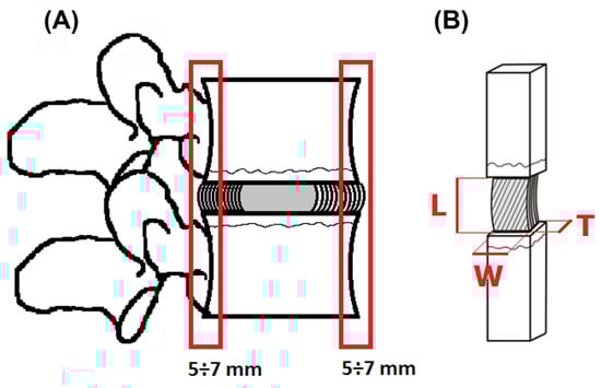 Diagram of the specimen preparation: (A) anterior and posterior parts of IVD; (B) geometric dimension of multilayer AF specimens with a fragment of the EP and vertebral body: L—length, W—width, T—thickness.