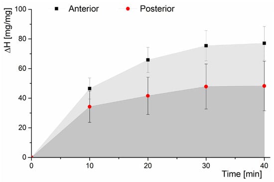 After the first 10 min, hydration (ΔH) increased by 46% in the anterior part and by 34% in the posterior part compared to the initial value. In the subsequent three hydration periods of 10 min each, the increase in hydration was much smaller. After 40 min, hydration of the AF amounted to 77% in the anterior part and 48% in the posterior part. The ΔH value was lower in the posterior part than in the anterior part due to differences in the AF structure.