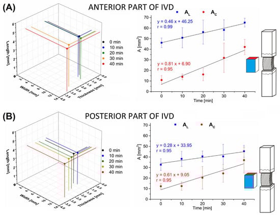 Average values of the cross-sectional area (AC) and longitudinal sectional area (AL) resulting from the change of geometric dimensions of multilayer AF specimens depending on the hydration time from: (A) anterior part of IVD; (B) posterior part of IVD. Linear correlations between AC and AL at hydration time.