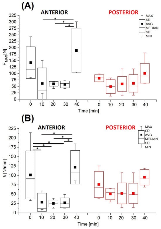 The mechanical parameters of multilayer AF specimens from anterior and posterior parts of IVD during hydration time: (A) maximum force (FMAX); (B) stiffness coefficient (k) (* p < 0.05).