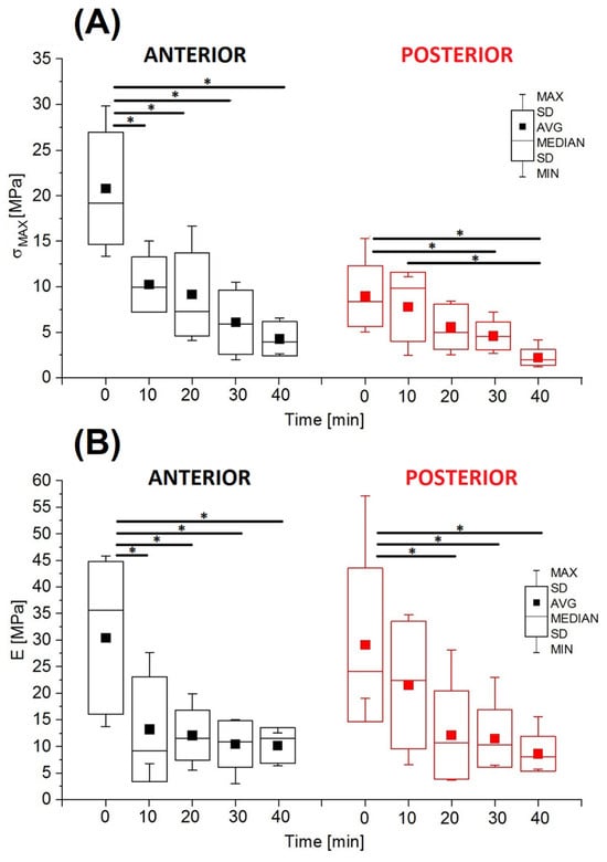 The mechanical parameters of multilayer AF specimens from anterior and posterior parts of IVD during hydration time: (A) ultimate tensile strength (σMAX); (B) Young’s modulus (E) (* p < 0.05).