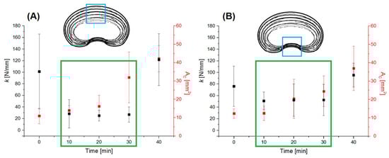 The characteristics of the stiffness coefficient—cross-sectional area (k–AC) of multilayer AF specimens depending on the hydration time from: (A) anterior part of IVD; (B) posterior part of IVD. The green box highlights the range of hydration times (10–30 min) in which stiffness values did not increase significantly despite a linear increase in cross-sectional area. The blue box in the schematic cross-sections indicates the analyzed region of the annulus fibrosus (AF) from which the specimens were collected and tested.