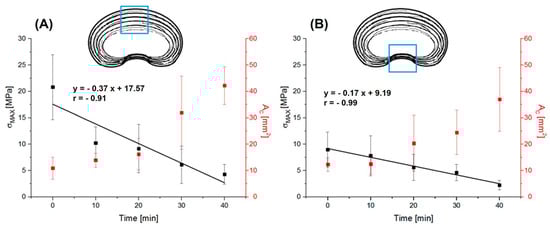 The characteristics of the ultimate tensile strength (σMAX)—cross-sectional area (σMAX—AC) of multilayer AF specimens depending on the hydration time from: (A) anterior part of IVD; (B) posterior part of IVD. The blue box in the schematic cross-sections indicates the analyzed region of the annulus fibrosus (AF) from which the specimens were collected and tested.