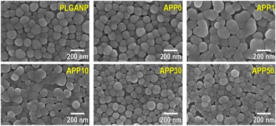SEM images of PLGANP, APP0, APP1, APP10, APP30, and APP50.