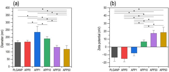 (a) Number-average hydrodynamic diameters and (b) zeta potentials of PLGANP, APP0, APP1, APP10, APP30, and APP50 in injection water (average + SD (absolute value), n = 4, * p < 0.05).