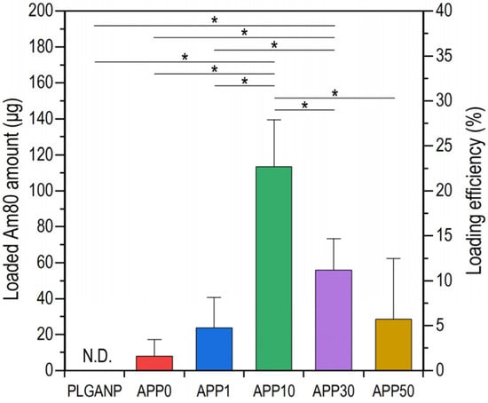 Loaded Am80 amounts (y-axis on the left) and Am80-loading efficiencies (y-axis on the right) of PLGANP, APP0, APP1, APP10, APP30, and APP50 obtained from a single batch of the preparation mixture (10 mL) (average + SD, n = 4, * p < 0.05).