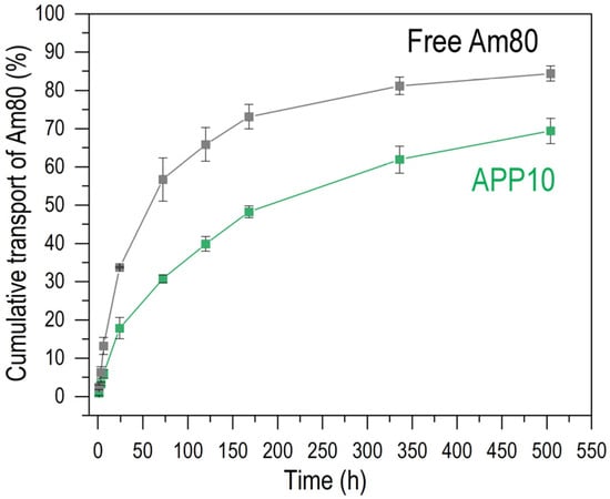 Time course of the percentage of cumulative Am80 transported into the outside PBS from the dialysis tube containing APP10 (green) and free Am80 (gray), with a net Am80 amount of 0.25 µmol (average ± SD, n = 3).