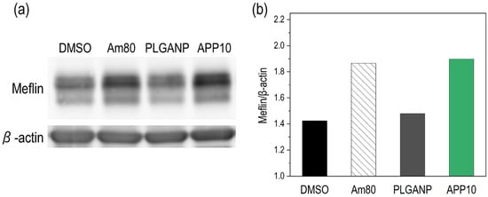 Meflin expression in fHDF/TERT166 cells analyzed via Western blotting. (a) Images of Western blot bands of Meflin and β-actin and (b) relative expression of Meflin to β-actin (quantified via densitometry) in the cells cultured with DMSO (negative control), Am80 (positive control), PLGANP, and APP10.