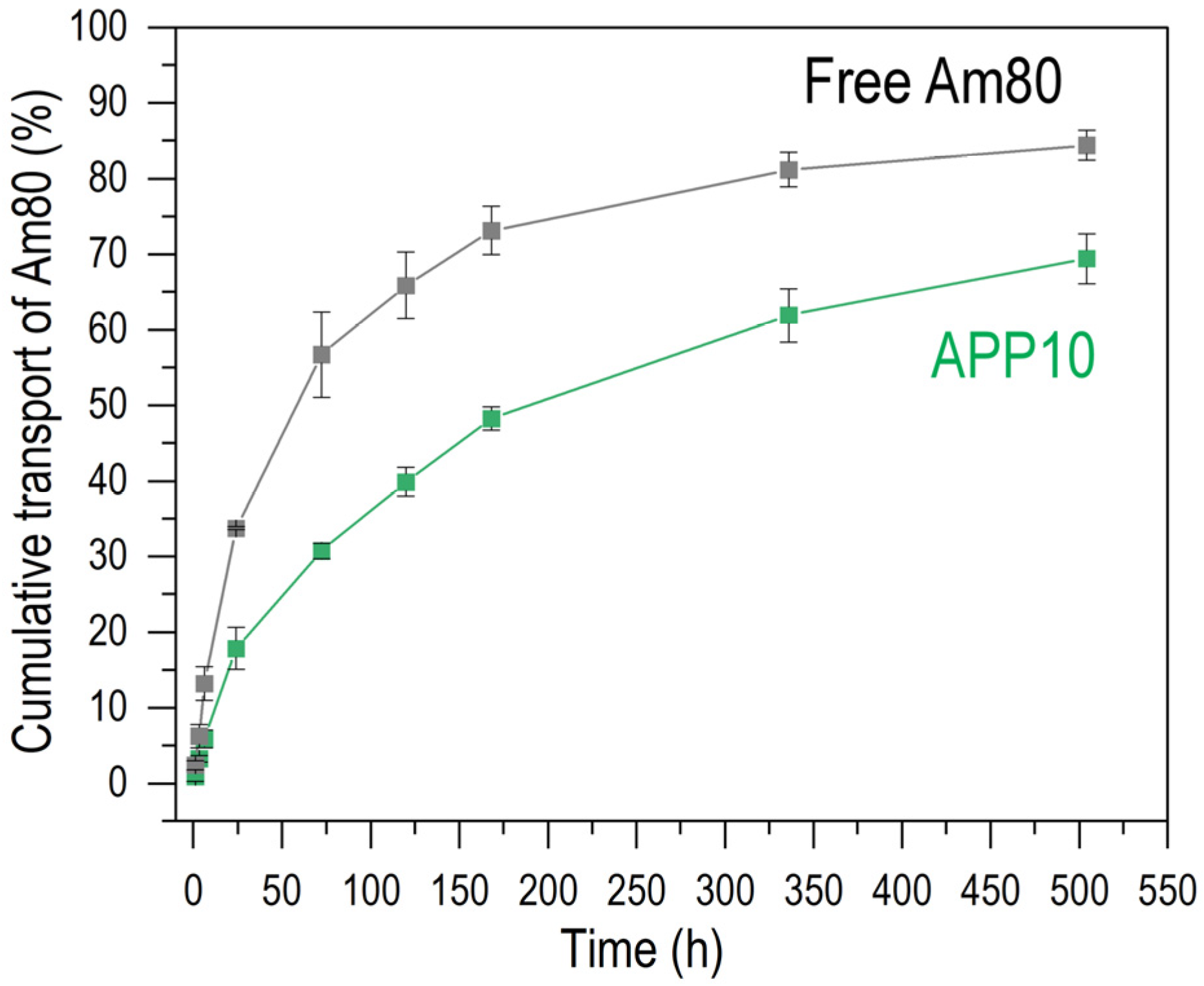 3.3. Am80 Release from Am80–PLGA Nanoparticles