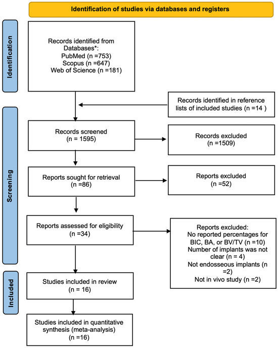This review was performed in accordance with the PRISMA guidelines (Preferred Reporting Items for Systematic Reviews and Meta-Analyses, INPLASY registration number: INPLASY202590035) [40]. Before initiating the systematic literature search, the PICO framework was defined as follows: the Population (p) was defined as animal models; the Intervention (I) was Ti implants modified or coated with silver; the Control (C) was defined as Ti implants without silver modifications or coatings; and the Outcome (O) was bone formation.