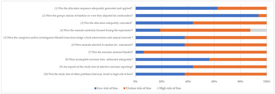 The assessment of the risk of bias based on the SYRCLE guide is displayed in Figure 3. In most studies, the risk of bias was judged to be unclear for both allocation concealment and outcome assessor blinding. Domains related to random sequence generation and selective outcome reporting showed lower levels of concern. Overall, variability in methodological care was observed among the included studies.