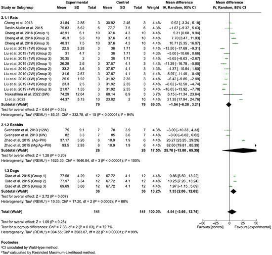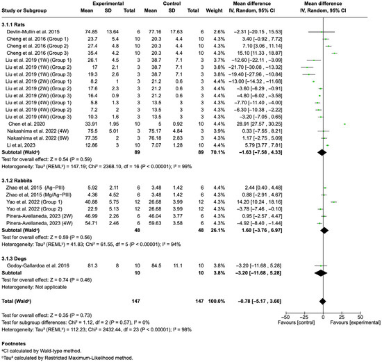 The analysis of BV/TV (Figure 6) also showed no statistically significant overall difference (Z = 0.35, p = 0.73). High heterogeneity was detected across studies (Tau2 = 112.23; Chi2 = 2432.44, df = 23 (p < 0.001); I2 = 98%).