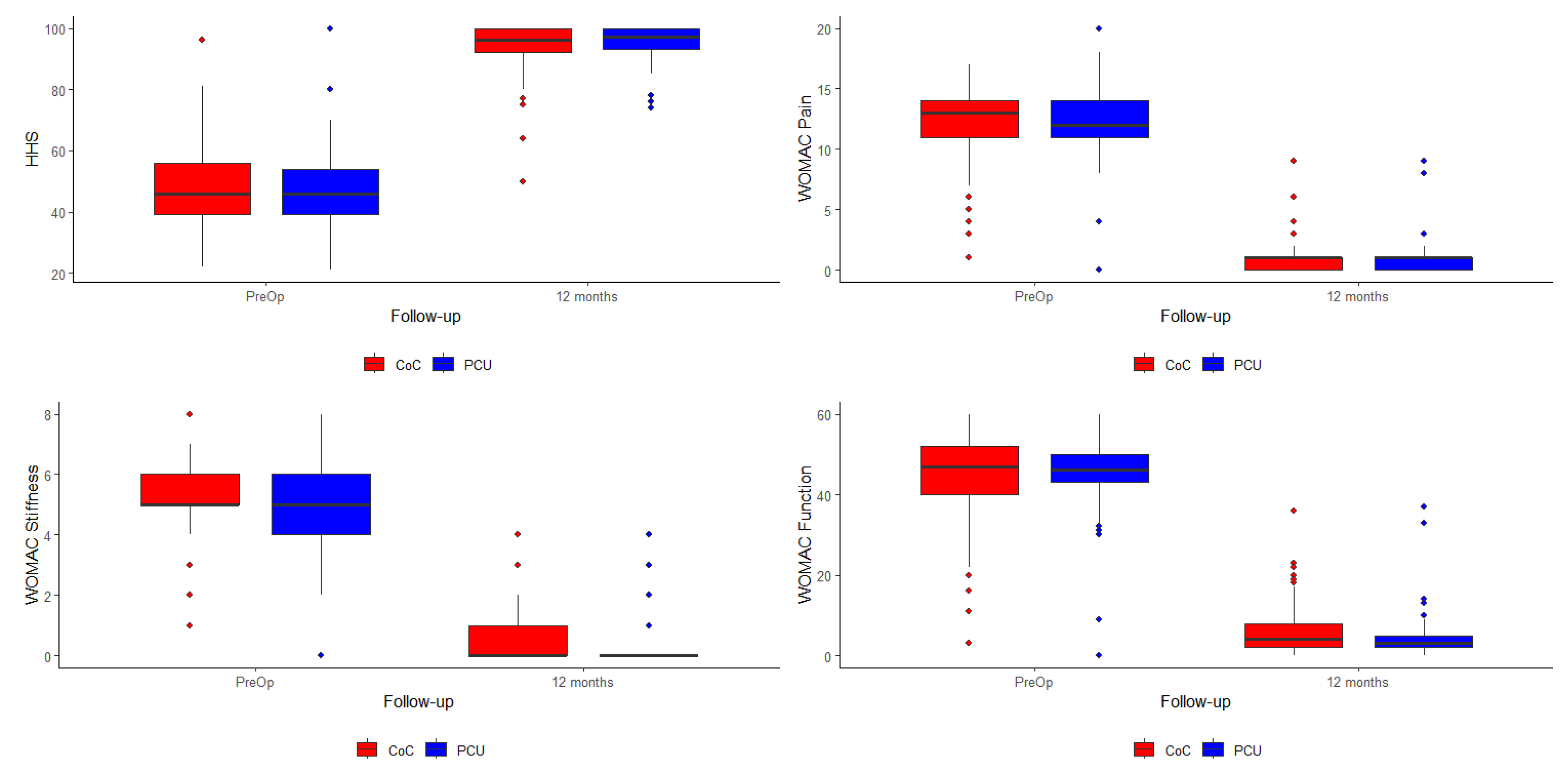 WOMAC Pain—Pre-Op | 12.1 | 12.1 | 0.983 |