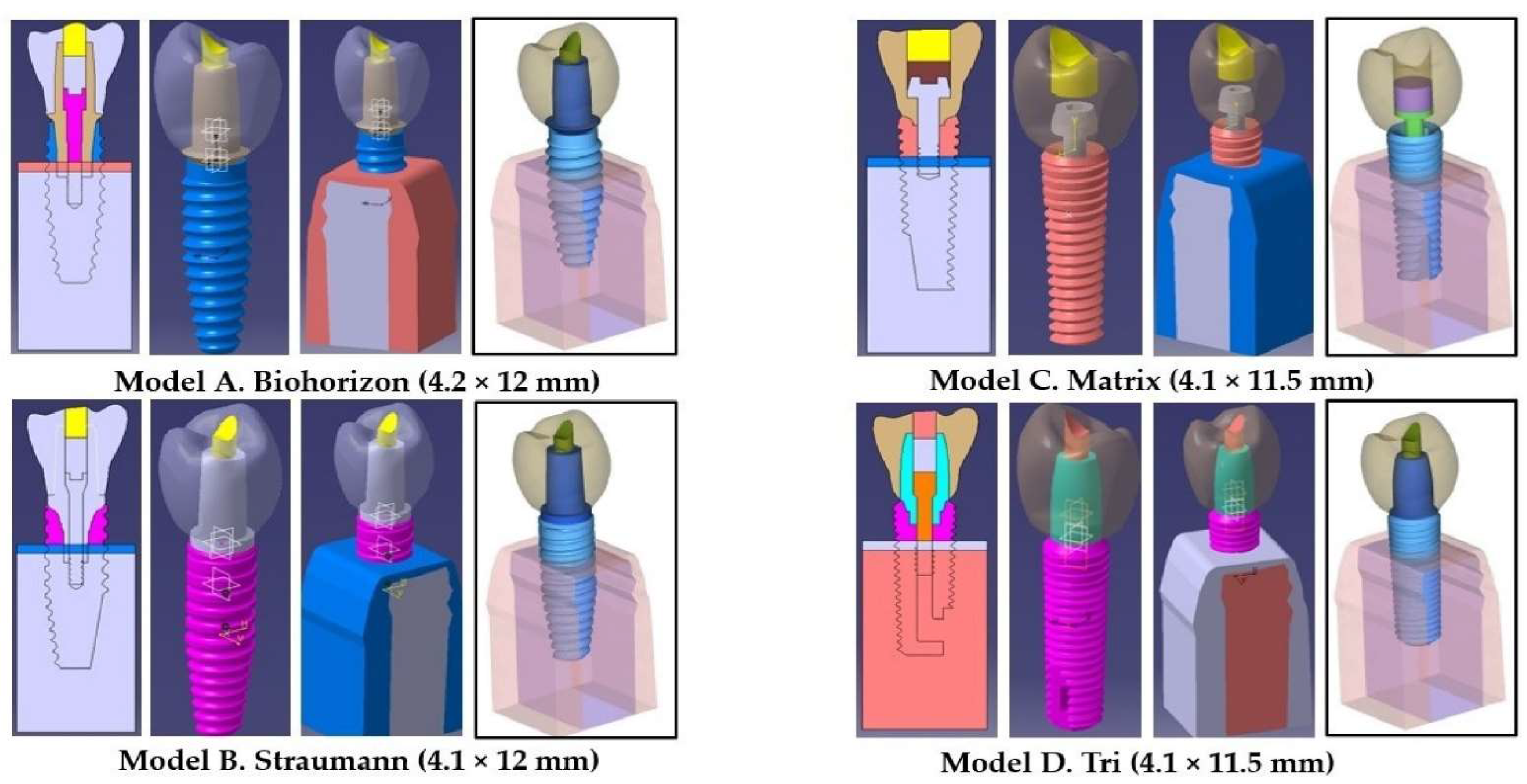 30]; and Model D represented the implant system with the abutment of the same manufacturer (TRI Dental Implants, AG, Switzerland) (