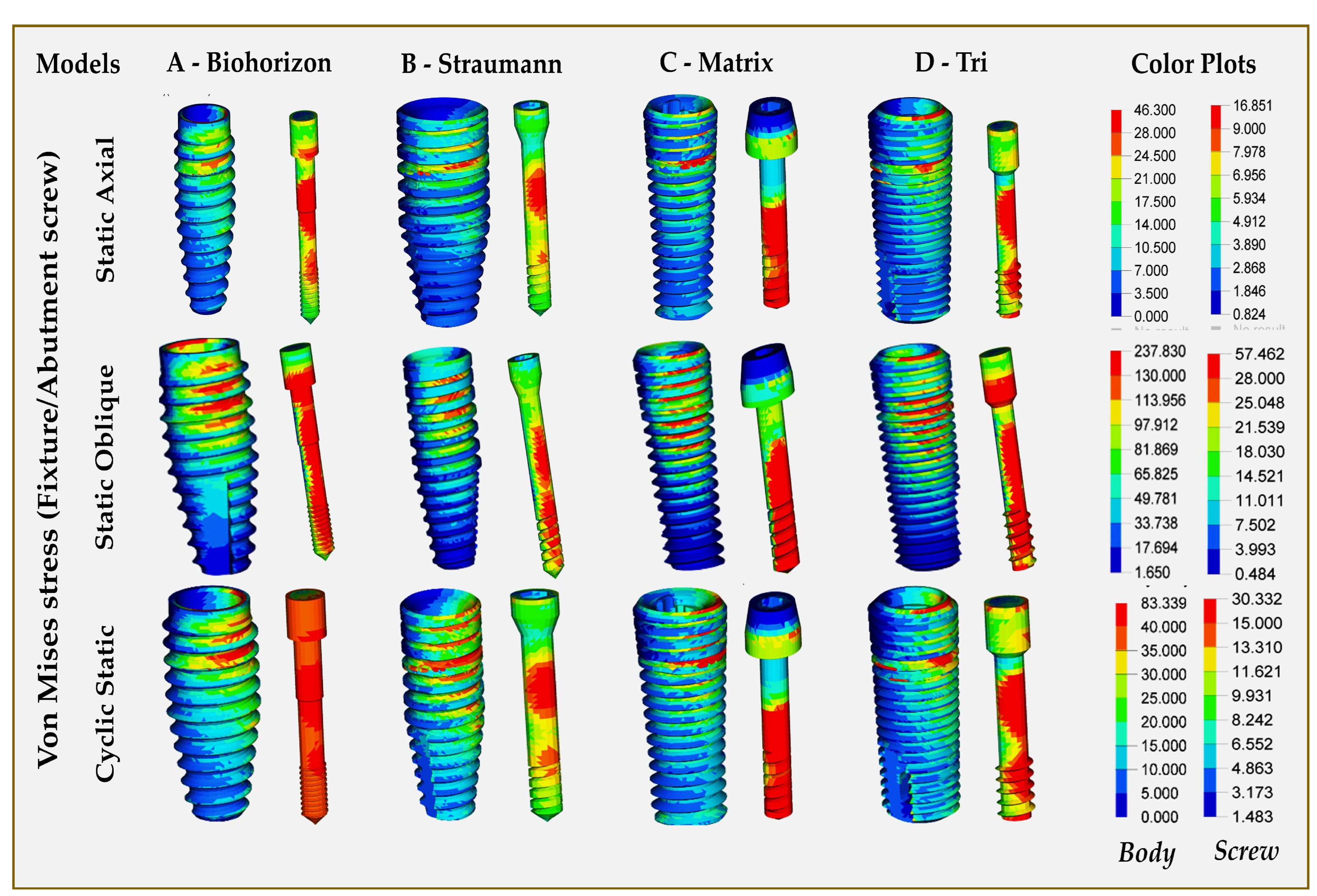 Figure 2 displays the stress distribution levels in implant fixtures subjected to both static and cyclic static loading for all models. The maximum VMS for implant fixture in static and cyclic static loads was seen in Model C (Matrix, abutment-free, titanium grade 5 ELI), while model D (Tri, with abutment, titanium grade 5 ELI) showed the highest stresses in oblique loading (237.83 MPa) (