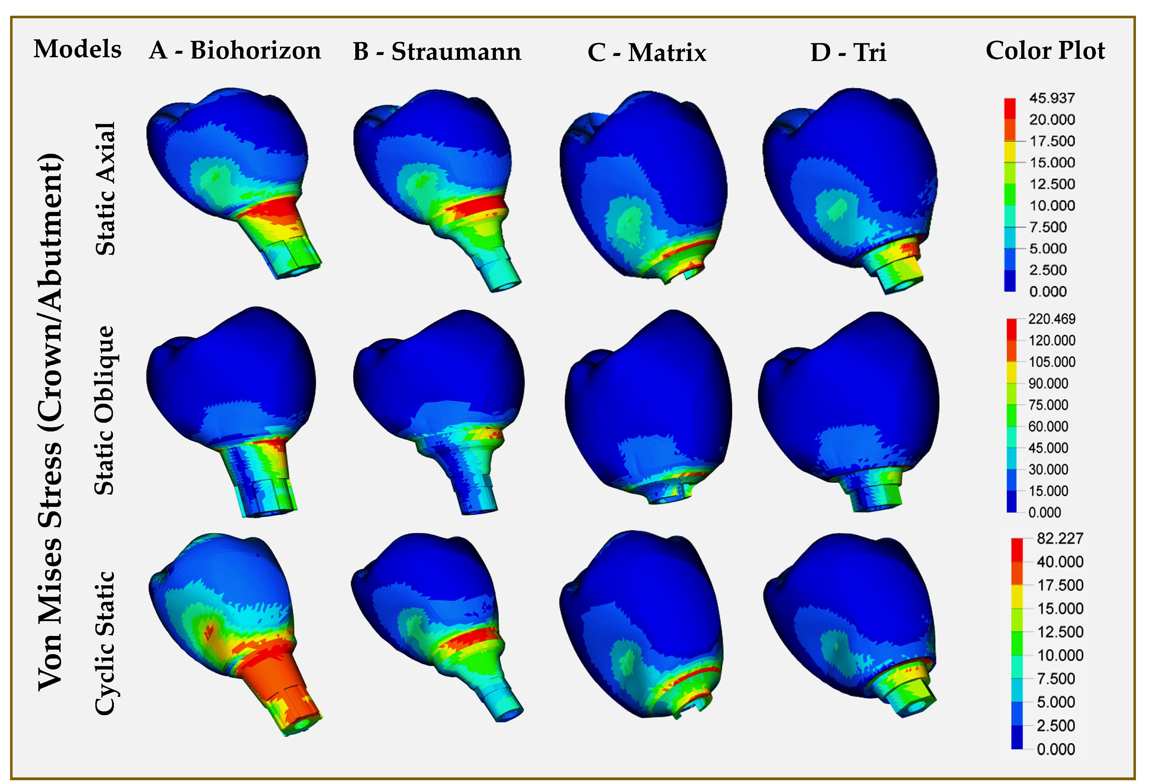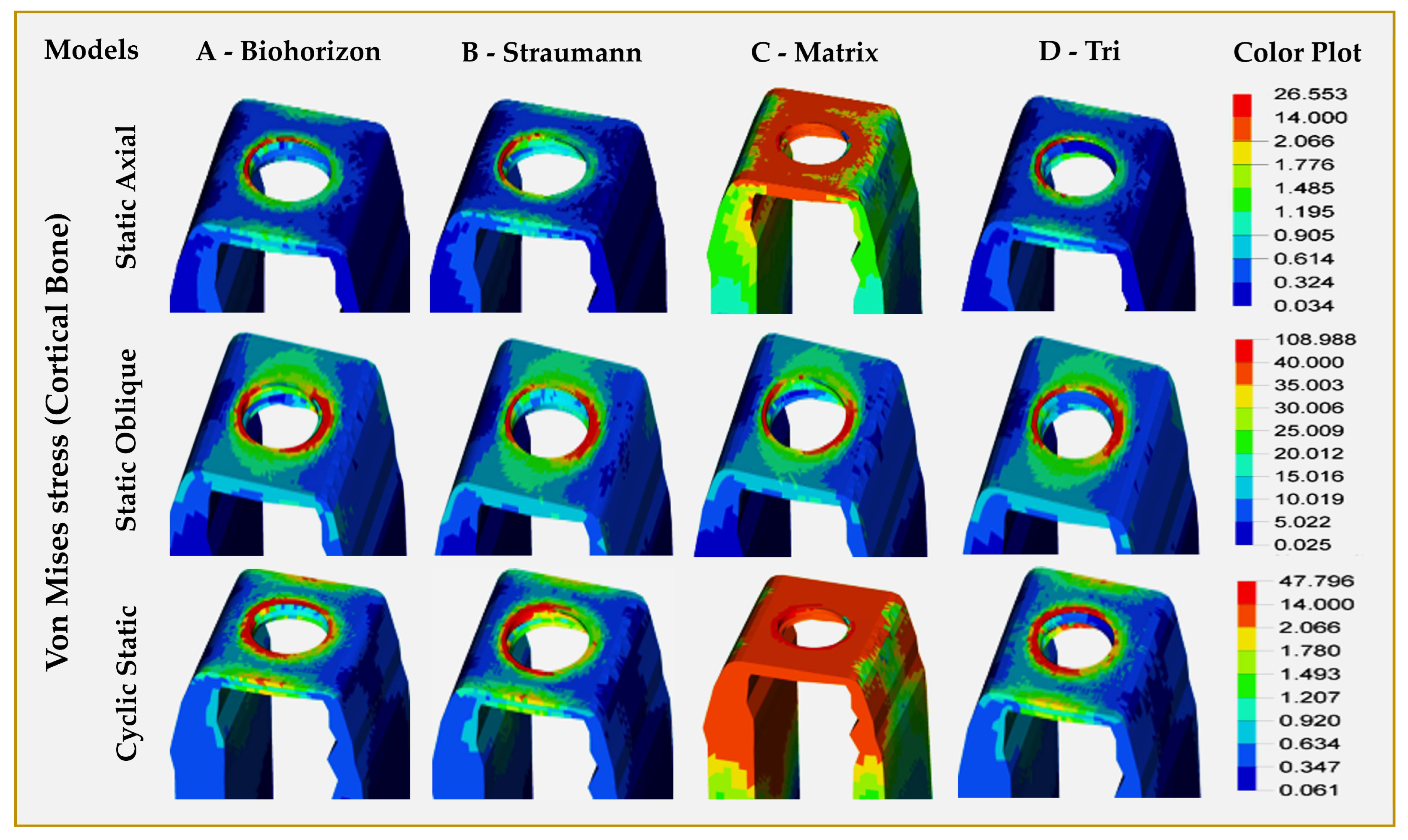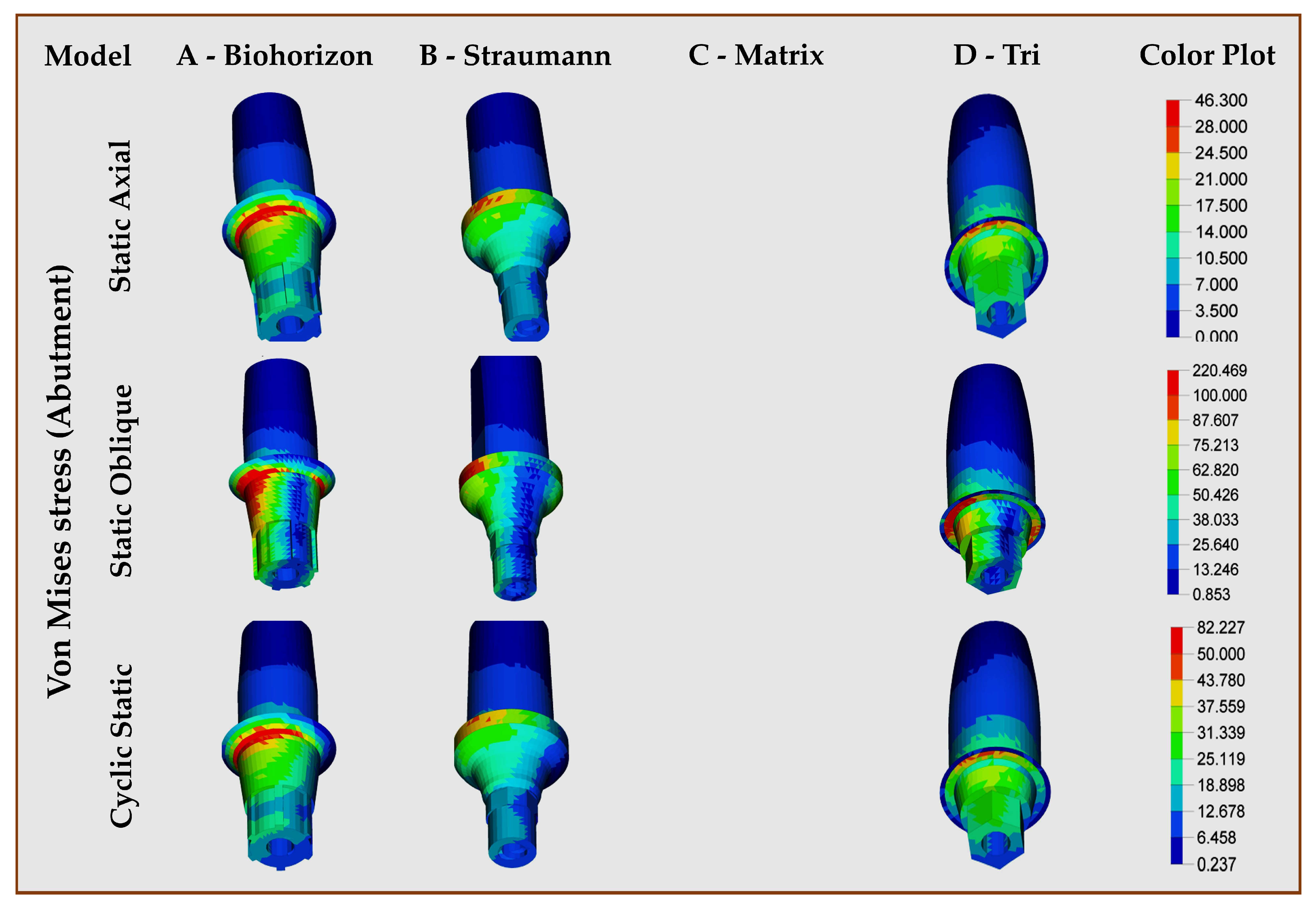 Figure 7), while the highest static oblique-related stress levels were seen in Model C (Matrix, abutment-free, titanium grade 5 ELI). For cyclic static axial-related stress levels, the highest values were seen for Model B (Straumann, Roxolid) and the lowest were seen for model D (Tri, with abutment, titanium grade 5 ELI).