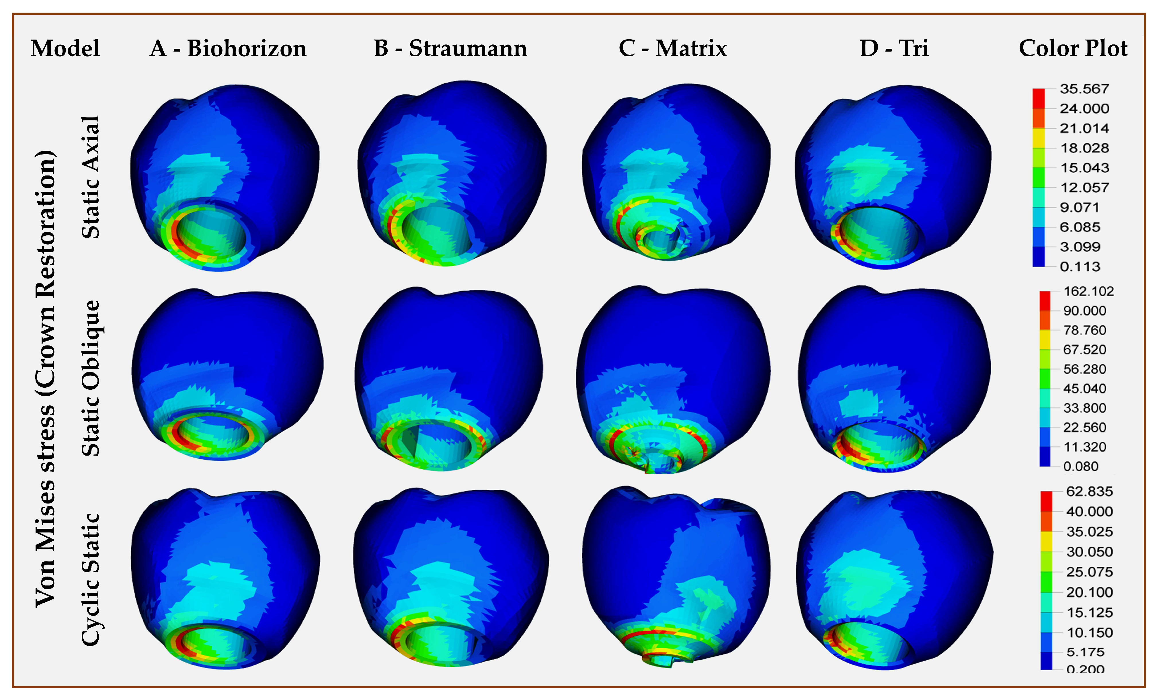 Figure 4 presents the stresses within the crown restorations of each model. Model D crown (Tri, with abutment, titanium grade 5 ELI) had the highest VMSs in both static (35.57 Mpa) and cyclic static (62.84 Mpa) axial loading, while Model C crown (Matrix, abutment-free, titanium grade 5 ELI) had the highest stresses in oblique (138.44 Mpa) loading. The FEA of the crown with abutment showed the highest VMS levels in all types of loading for Model A (BioHorizons, wrought titanium), while Model B (Straumann, Roxolid) showed the least stress values for both static and cyclic static, axial and oblique loads. The VMS of Model C (Matrix, abutment-free, titanium grade 5 ELI) was lower than model D (Tri, with abutment, titanium grade 5 ELI) and Model A in static and cyclic static loads. Under oblique loading, however, the abutment-free had higher stress levels (214.05 MPa), which were almost similar to Model A (