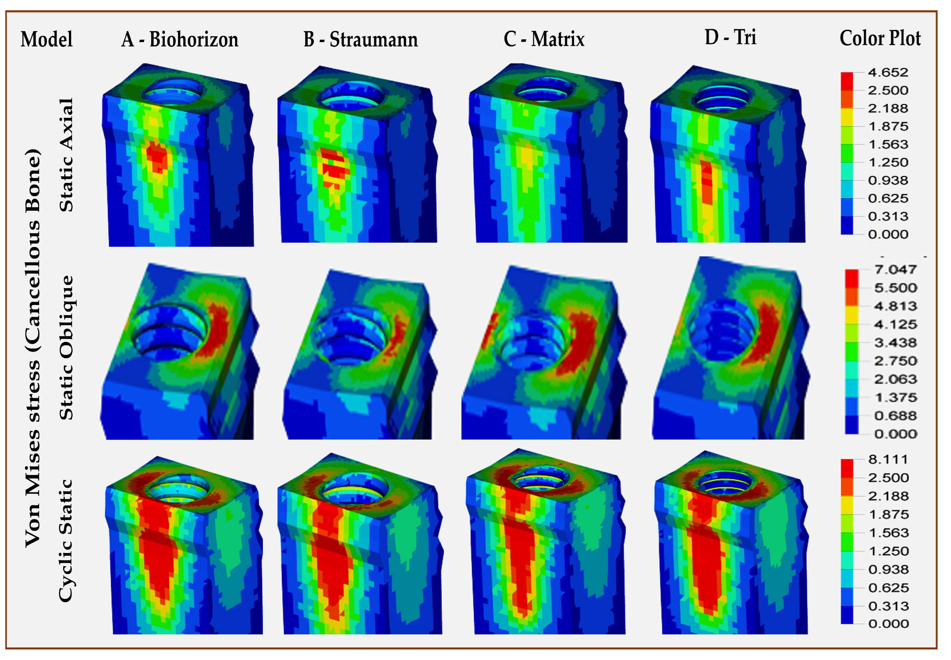 Figure 6). There were wide variations for stress levels observed in cancellous bone among different models under different loads. The highest static axial-related stress levels in cancellous bone were observed in Model B (Straumann, Roxolid) (