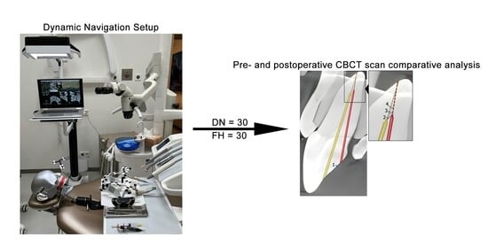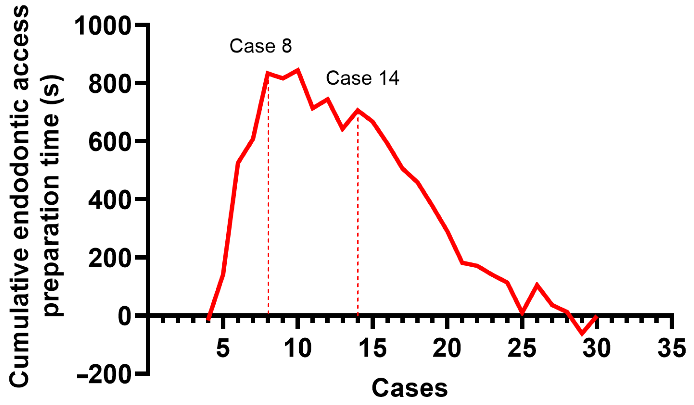 - Sharma, S.; Haldar, P.; Kumar, V.; Chawla, A.; Logani, A. Learning Curve for Dynamic Navigation Procedure during Endodontic Management of Permanent Maxillary Anterior Teeth with Pulp Canal Calcification: A Risk-Adjusted Cumulative Summation Analysis of a Single Operator’s Experience. J. Endod. 2025, 51, 295–302. [Google Scholar] [CrossRef] [PubMed]