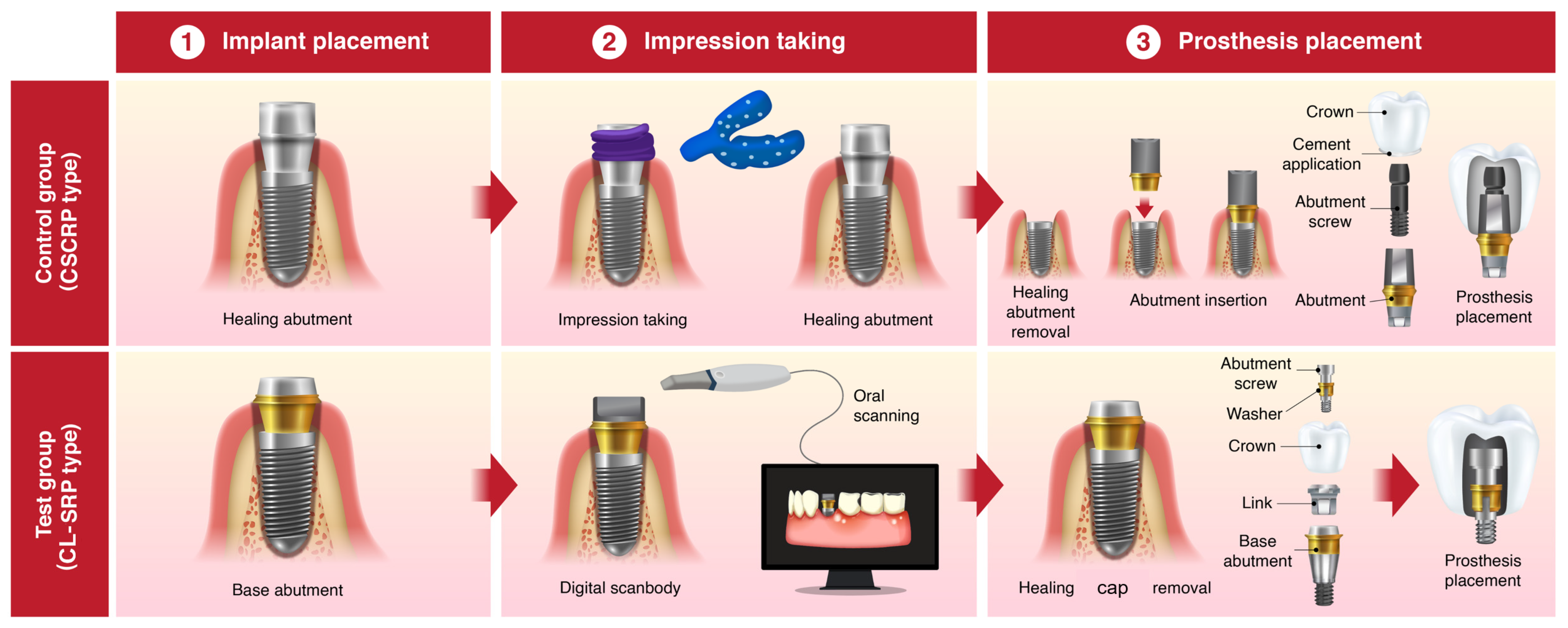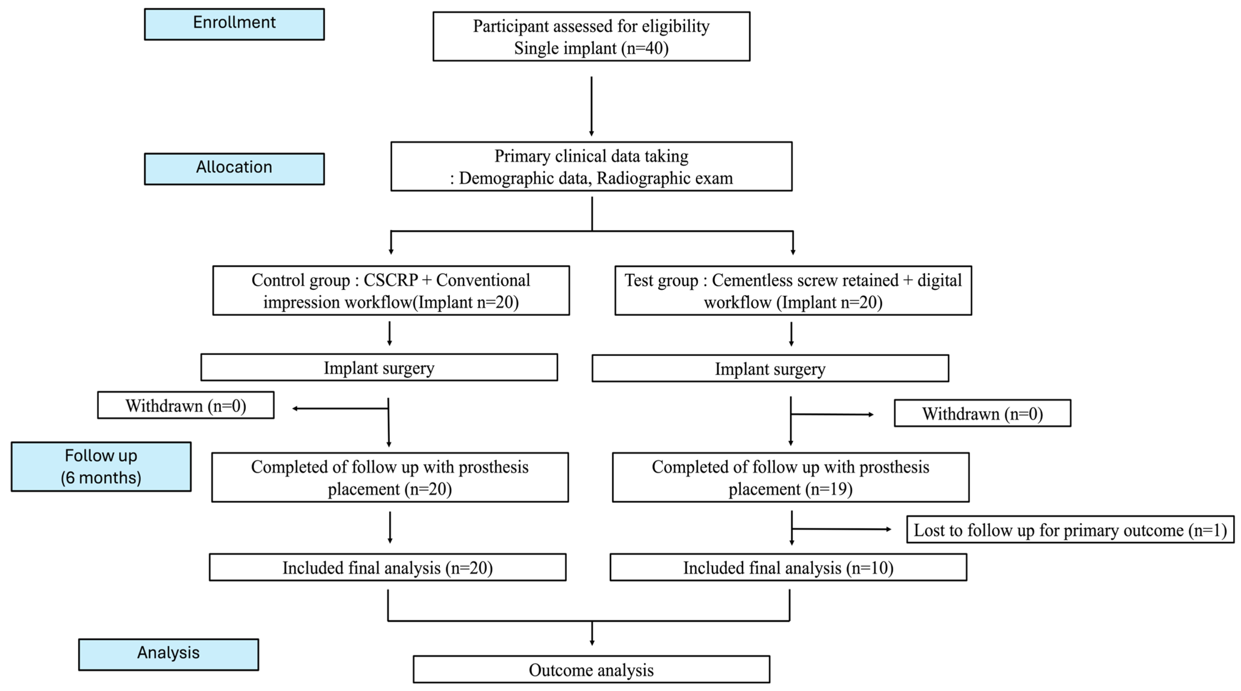 This randomized controlled clinical trial was designed to evaluate the clinical efficiency and outcomes of a conventional CSCRP workflow and a fully digital CL-SRP workflow in posterior single-implant restorations. A total of 40 implants in 35 patients were included and randomly allocated to two groups: 20 in the control group (CSCRP, conventional workflow) and 20 in the test group (CL-SRP, digital workflow).