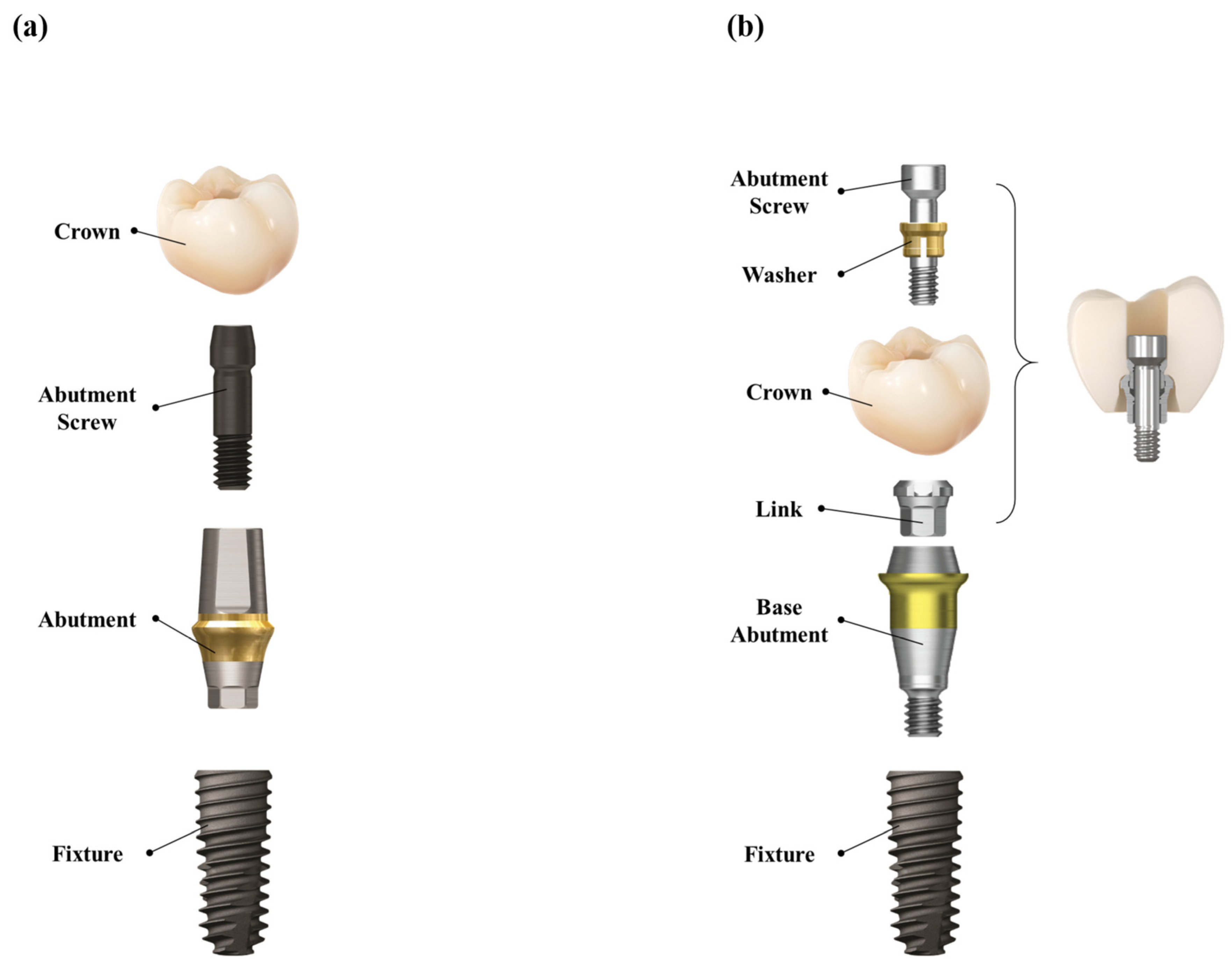 All implant surgeries were performed by oral and maxillofacial surgeons using a one-stage surgical protocol, followed by a healing period of approximately 12 weeks. Two prosthodontists completed the final prosthetic procedures. In both groups, implants were placed using the Osstem TS III system (Osstem Implant Co., Ltd., Seoul, Republic of Korea), with diameters ranging from 4.0 to 5.0 mm and lengths of 8.5 to 11.5 mm. All implants were positioned approximately 1 mm subcrestally in accordance with the manufacturer’s guidelines to ensure consistency for subsequent marginal bone level evaluation. Prostheses in the test group were fabricated using the Digital Retained screw system (DR screw system, Osstem Implant Co., Ltd., Seoul, Republic of Korea). The overall clinical observation period was approximately 6 months.