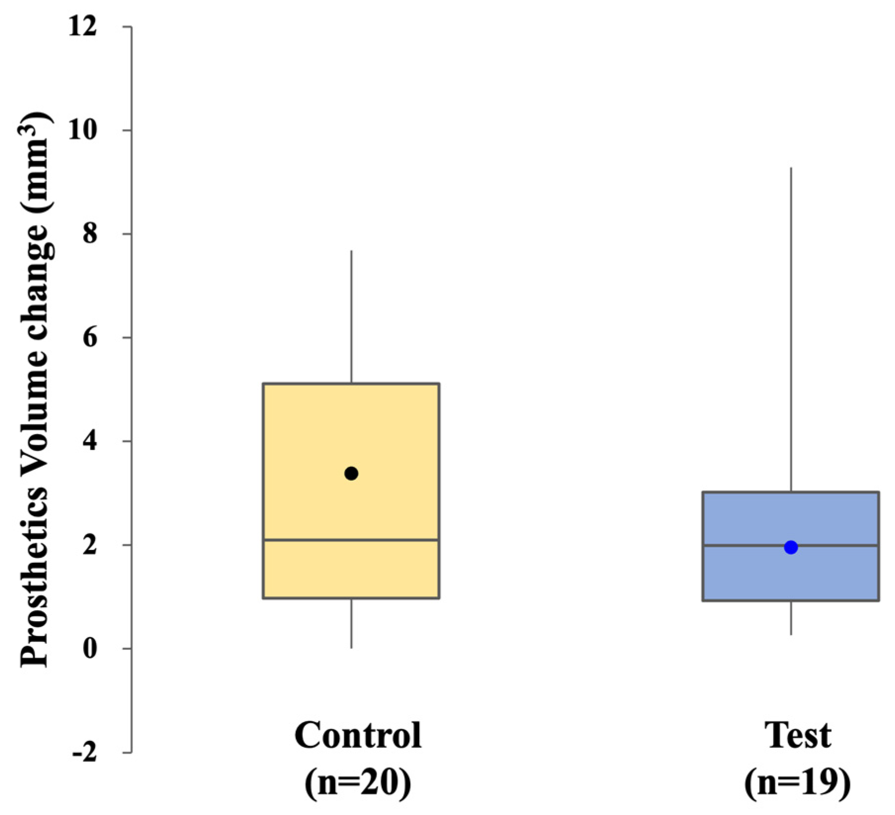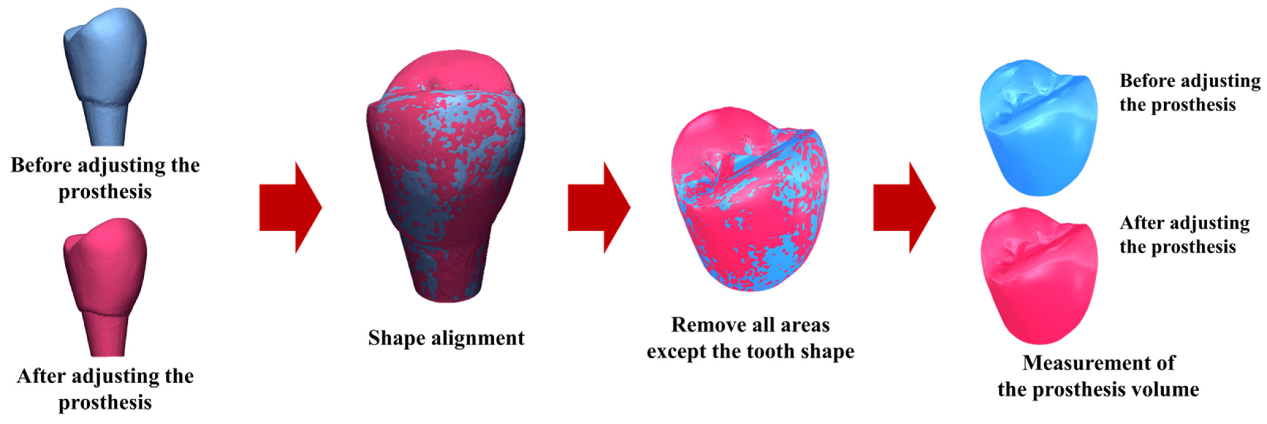 Prosthetic accuracy was evaluated by quantifying the volume of zirconia crown material removed during clinical adjustment. Each crown was scanned before any adjustment and again after the adjustment procedure, with the crown consistently stabilized in the same orientation for both scans. The stereolithography (STL) files obtained before and after adjustment were superimposed, aligned, and analyzed using Geomagic Control X software (ver. 2022.0.1, 3D Systems Inc., Rock Hill, SC, USA). The software automatically calculated the volume of material removed during adjustment.