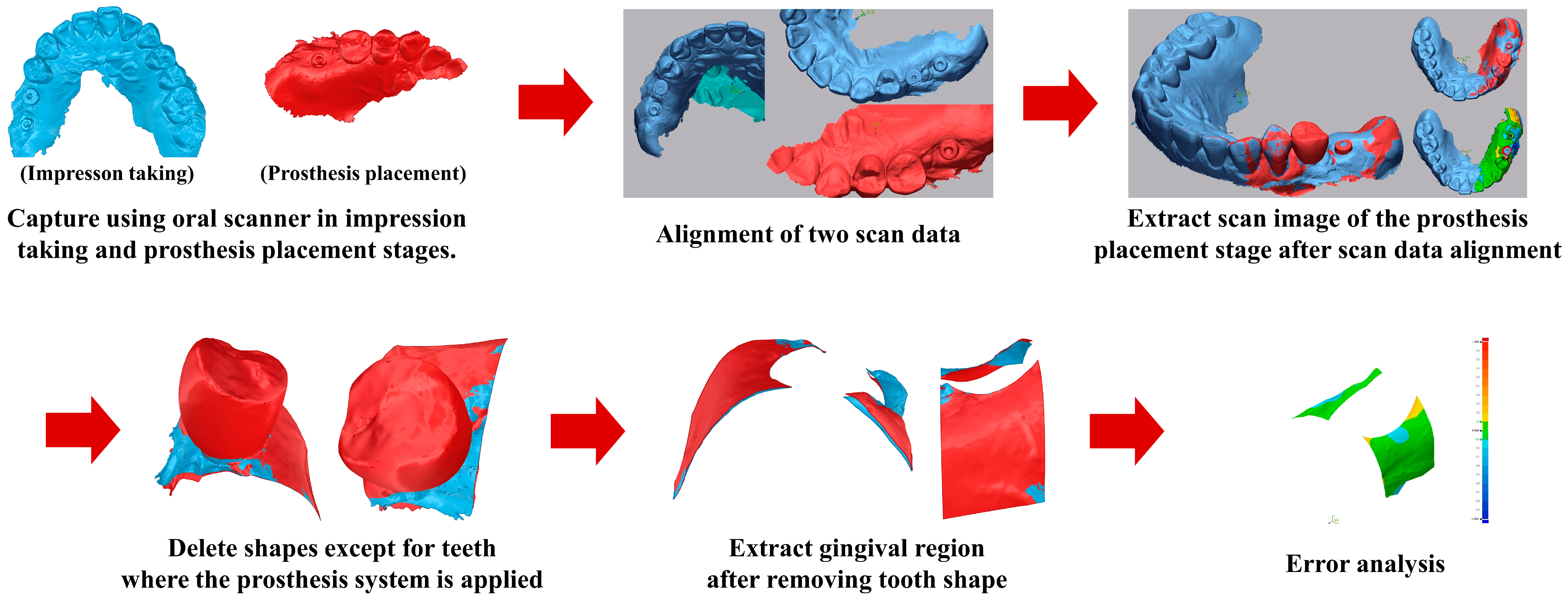 The trimmed surface models were superimposed using three-dimensional analysis software, and volumetric and linear changes in the gingival contour were calculated. This approach enabled the quantification of peri-implant soft tissue changes between impression-taking and final prosthesis delivery [