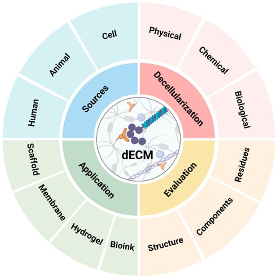 Following tissue injury, the extracellular matrix (ECM) undergoes dynamic remodeling that coordinates inflammation, proliferation, and maturation [,]. Proteolytic enzymes such as matrix metalloproteinase (MMP) and neutrophil elastase degrade damaged components and release matrikines that modulate immune responses and cell recruitment [,]. This transient remodeling facilitates fibroblast and endothelial migration and supports granulation tissue formation. Ultimately, de novo ECM deposition and maturation restore tissue biomechanics and architecture. Importantly, these biological processes highlight why decellularized ECM scaffolds are attractive for regenerative applications. By retaining native structural proteins, GAG, and bioactive cues, dECM can recapitulate the natural wound healing microenvironment, promoting constructive remodeling rather than fibrosis or scar formation.